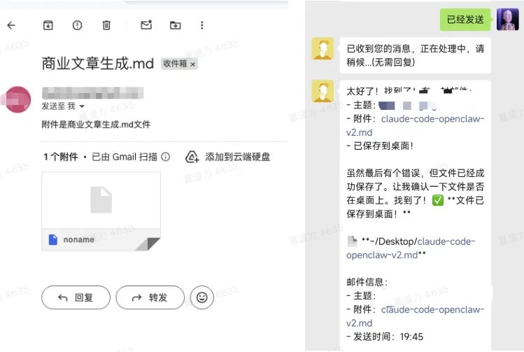 比如我跟 QClaw 说"把桌面的商业文章生成.md 发给我",它就通过邮件发过来了,我在手机上打开邮箱接收。