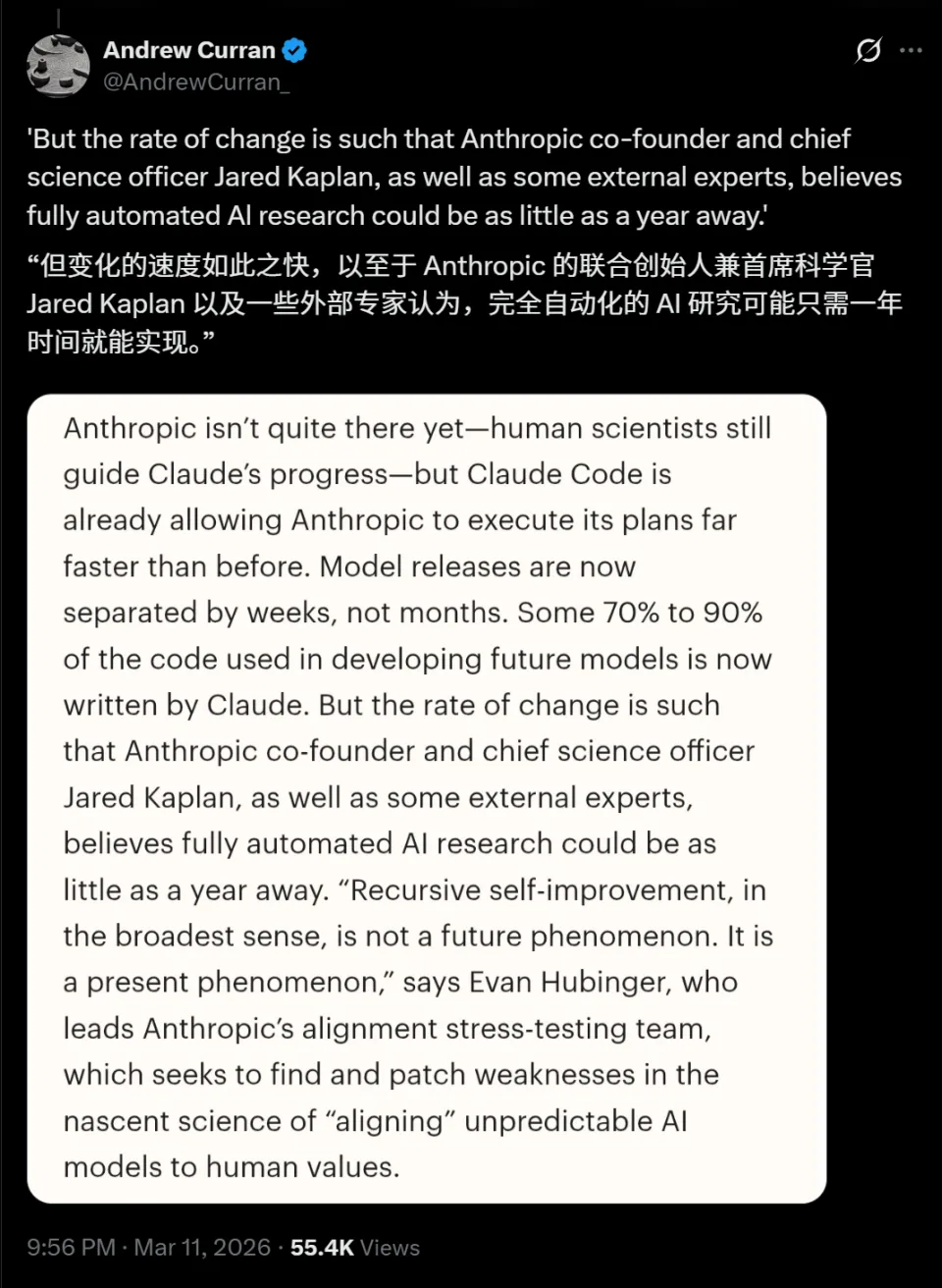AI变化的速度如此之快,以至于Anthropic联创兼首席科学官Jared Kaplan以及一些外部专家认为,完全自动化的AI研究,可能只需一年时间就能实现!