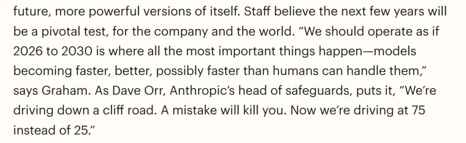 Anthropic的安全负责人Dave Orr是这样形容当前的AI发展的:「我们在悬崖边的山路上开车,犯一个错误就会死。」