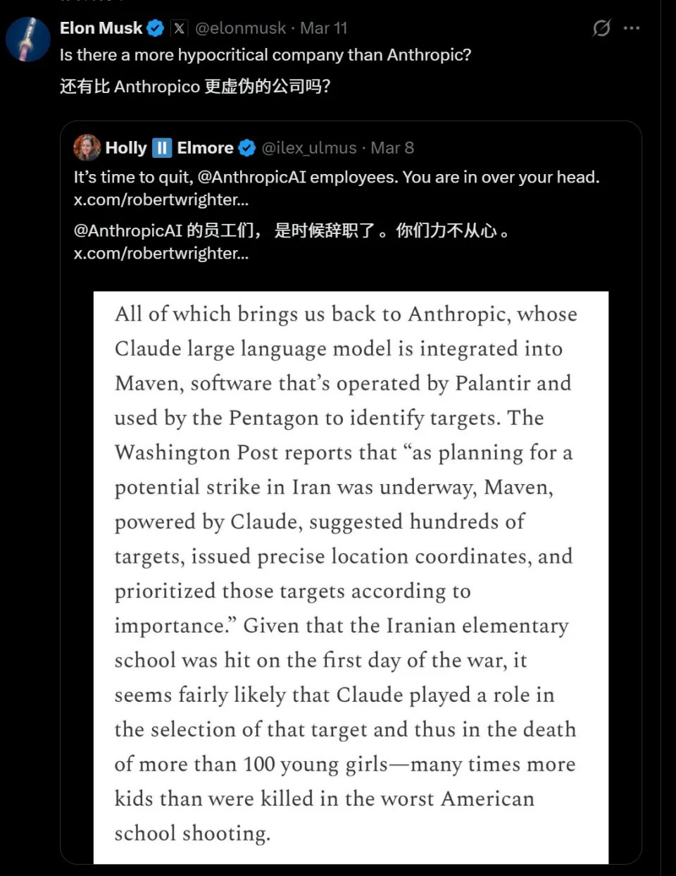 有趣的是,就在最近,马斯克转发了Claude参与伊朗空袭数百个目标选择的信息,锐评道:还有比Anthropic更虚伪的公司吗?