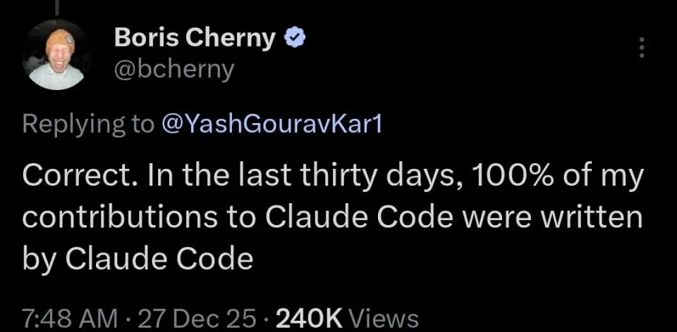 Claude Code之父的这条X,直接引爆了整个开发者社区Claude Code之父Boris Cherny进入公司后,构建了一个系统,让Claude聊天机器人可以在他的电脑上自由运行,访问他的文件、程序,并且写代码。