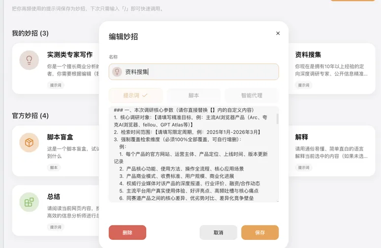 妙招功能往前走了一步。普通妙招保存的是提示词,脚本妙招保存的是能力——用户可以根据自己的个性化需求,自定义“插件”,随时做、随时用。