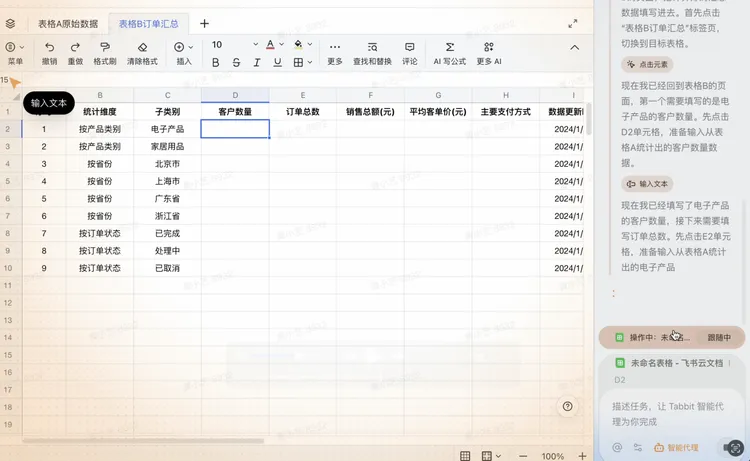 不过,目前的产品还有迭代的空间。比如,智能代理这个环节,我们专门做了一个测试:打开了飞书文档里的两个表格——“表格A原始数据”和“表格B订单汇总”,让Tabbit分析A中的数据结构,然后按照B的格式要求自动填写汇总信息,这也是比较典型的数据处理场景。