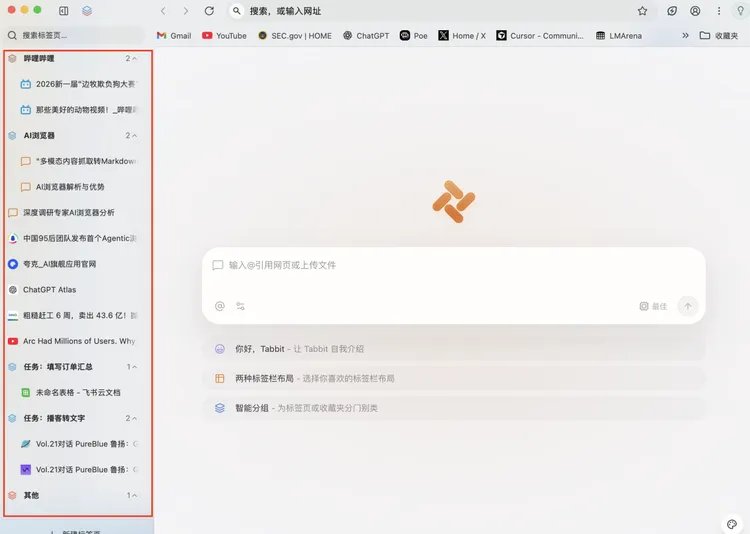 其次,是智能标签页——我同时打开了十几个页面,Tabbit自动将标签分类整理,行业报告归一类、产品官网归一类,导航栏一目了然,治愈了强迫症患者。