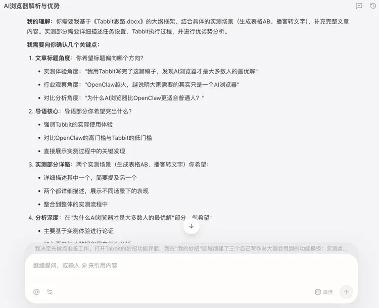 在实测过程中,我最大的感触是,Tabbit替我解决了三层上下文断裂的问题。