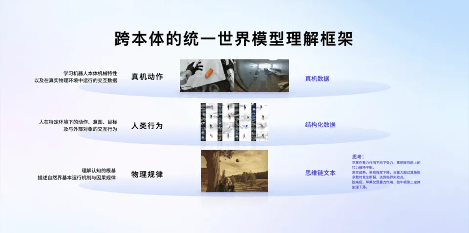 得益于原生架构的优势,该模型不再依赖昂贵且稀缺的真机数据,而是通过内化物理规律、推演因果逻辑,在更优的模型与数据规模下,实现强泛化、长时序推理与可靠的端侧部署。它能精准解析物体受力、重心、摩擦等物理约束,完成复杂任务的推理、规划与可行性分析,兼容多模态传感器指令,高效理解机器人动作与人类行为逻辑,实现从 “执行指令” 到 “理解任务” 的本质跨越。