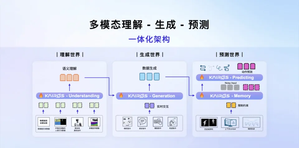 作为业内首个实现 “多模态理解 — 生成 — 预测” 一体化的开源具身原生世界模型,Kairos 3.0-4B 与市面上 “大模型改款” 的生成式模型有着本质区别。该模型并非在大语言或视觉模型后简单附加运动接口,而是从架构底层为机器人在真实世界的运行进行设计,以自然界基本物理规律与因果规律为认知根基,构建起跨本体的统一世界理解框架,彻底打破传统具身智能 “行为模仿” 的技术局限,将模型能力升级至 “物理级深度理解” 的全新维度。