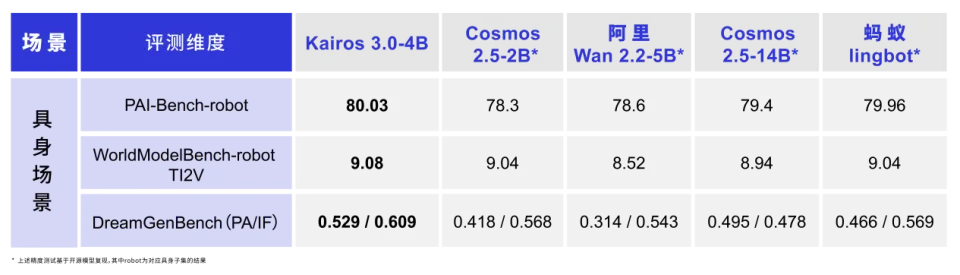 在具身场景中,Kairos 3.0-4B 在三项权威 Benchmark 中均实现性能领跑: