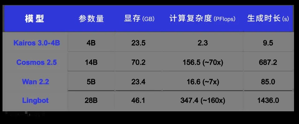 Kairos 3.0-4B 以 4B 轻量化参数实现 23.5GB 显存占用,与 5B 的 Wan 2.2 相当,远低于 14B 的 Cosmos(70.2GB)和 28B 的 Lingbot(46.1GB),在保持极致性能的同时,大幅降低部署门槛,完美适配具身智能端侧实时推理需求,打破“大参数 = 高性能”的行业固有认知。