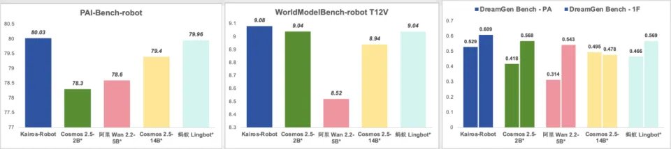 Kairos 3.0-4B 以 80.03 分领跑,全面超越 Cosmos 2.5-2B(78.3 分)、阿里 Wan 2.2-5B(78.6 分)、Cosmos 2.5-14B(79.4 分)及蚂蚁 Lingbot(79.96 分),验证了其在具身任务执行、物理交互稳定性上的行业第一地位。