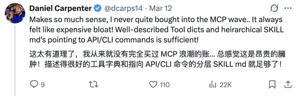 网友们的想法都挺一致的,尤其是 Skills 逐渐占据了智能体应用的主场后,MCP 似乎早就应该消失了。
