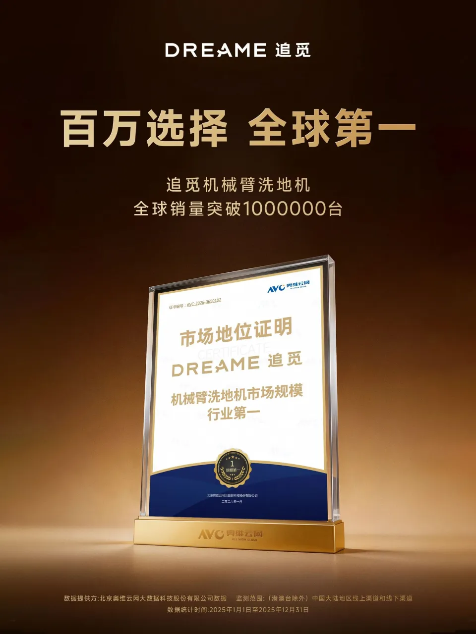 不到两年时间,机械臂洗地机这一新赛道已迅速成形。凭借持续的技术迭代,追觅在AWE 2026正式发布机械臂3.0产品T70 Ultra Station,并斩获代表行业最高技术认可的艾普兰金奖;与此同时,追觅机械臂洗地机累计销量突破一百万台,稳居全球销量第一。