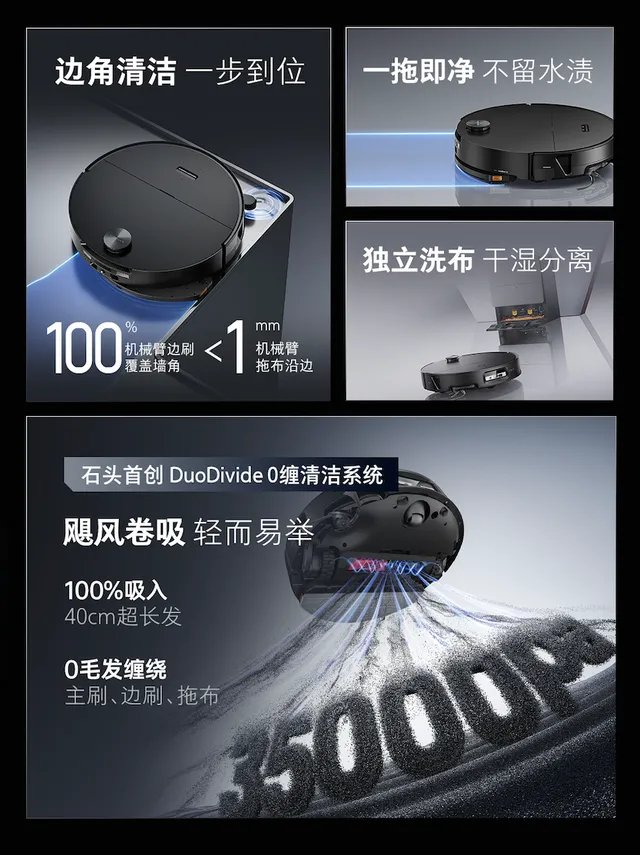 吸力从几年前的两三千帕攀升到如今的35000帕,DuoDivide双悬臂对刷系统从源头实现零缠绕,四区双震拖布以每分钟4000次高频震动瓦解顽固污渍。清洁力的提升是指数级的。