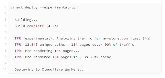 理念很简单:Cloudflare 本身就是你网站的反向代理,我们掌握着你的流量数据,清楚哪些页面是实际被访问的。因此,vinext 既不会预渲染全部内容,也不会完全不预渲染,而是在部署时查询 Cloudflare 的区域分析,只预渲染那些关键页面。