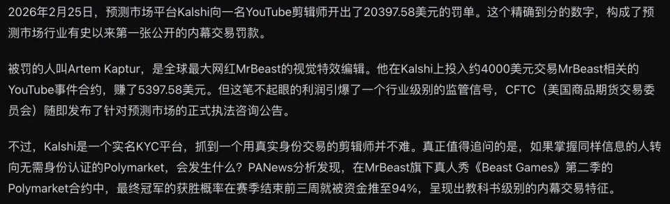 而他的一位视频剪辑师,利用自己能提前看到视频后台数据(比如发布时间、内容方向)的「职务便利」,在Kalshi上精准下注了大约4000美元。平台的监控系统发现他的交易成功率高得离谱——在极低赔率的盘口上几乎「百发百中」,统计学上几乎不可能是巧合。