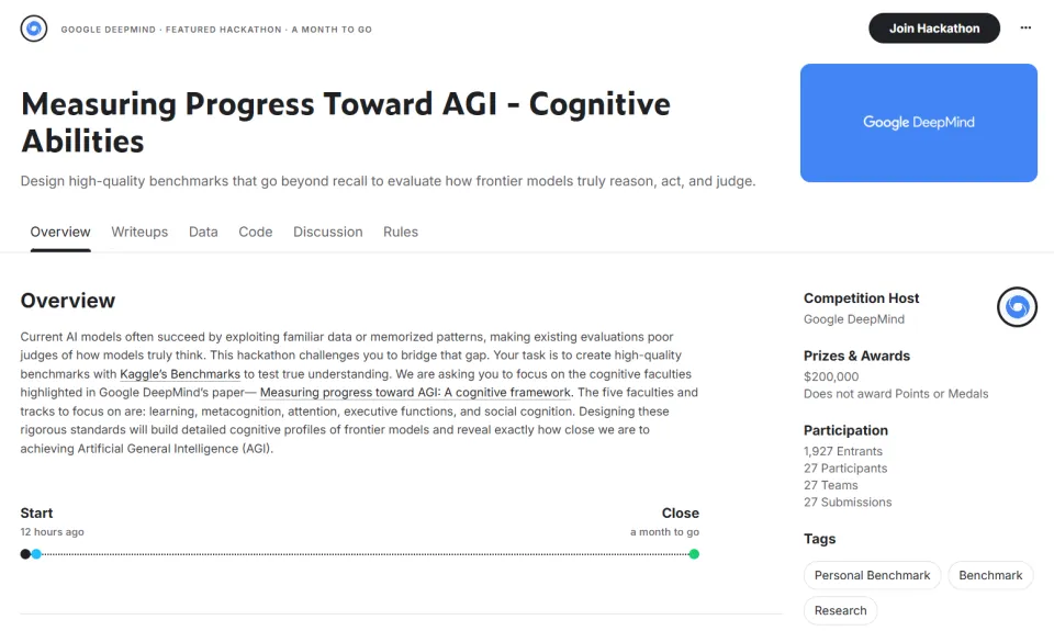 同时,谷歌DeepMind还向全球开发者,发起一场20万美元的Kaggle黑客松。