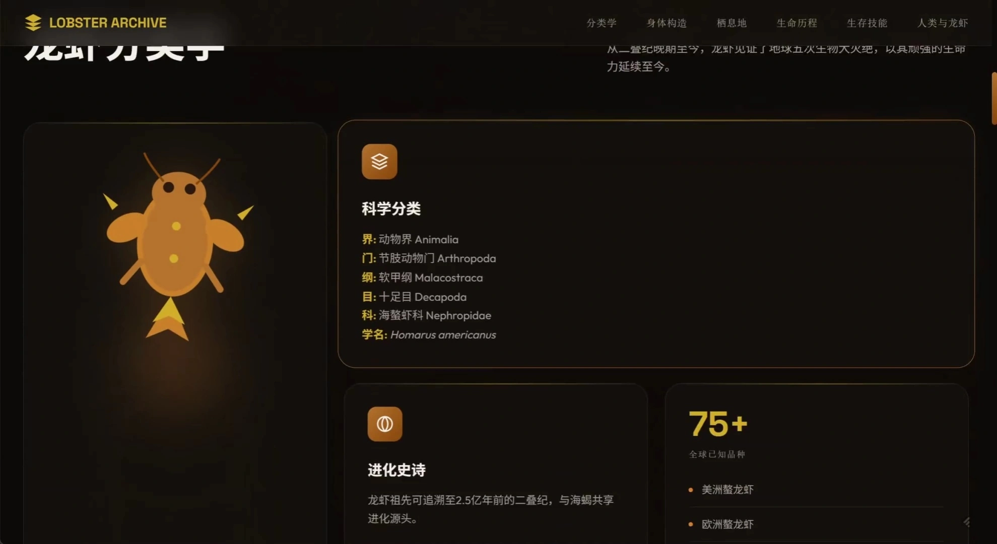 7 分多钟后,我们得到了第一版结果:龙虾档案室。在这里,我们可以简单了解有关真正龙虾的各种知识,包括它们的分类学、身体构造、生命历程以及与人类的关系等等。