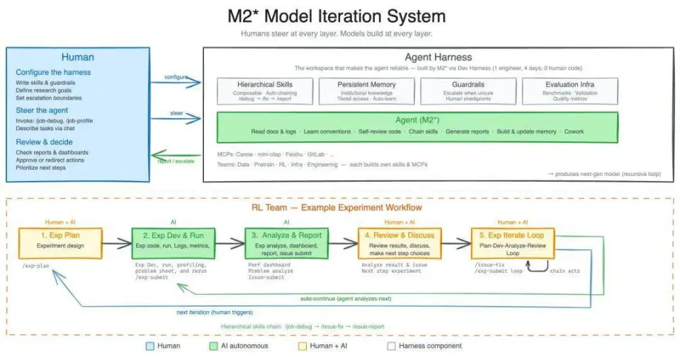 在 MiniMax 内部,Agent Harness 的价值已经得到了验证,仅用 1 人、4 天、零代码,M2 系列模型就以「架构师」身份自主搭建起完整的开发 Agent 系统,并在此基础上构建覆盖数据、训练、评测与记忆的研究型 Agent 体系。人类工程师只设定方向,模型完成构建,形成了「用 AI 迭代 AI」的自我进化闭环。