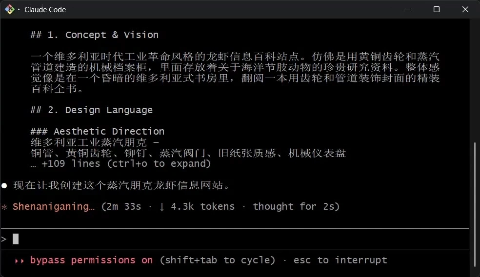 很快,技能就已经配置就绪。现在,我们的 M2.7 Claude Code 已经具备了更卓越的前端、全栈、安卓原生、iOS 应用、Shader 和 Gif 贴纸开发能力。下面我们就使用其中的前端技能让上面的龙虾档案室更加好看一些:使用 frontend-dev skill 优化以上龙虾档案室,让其更符合现代网页设计,更加炫酷。