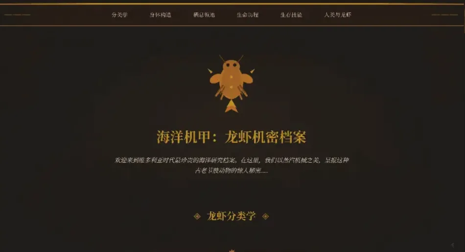 给我构建一个蒸汽朋克的龙虾信息网,但是里面的内容不是介绍 OpenClaw 这个网络龙虾,而是真正的龙虾。在网上找一些素材和介绍放入其中,让网站信息丰富。
