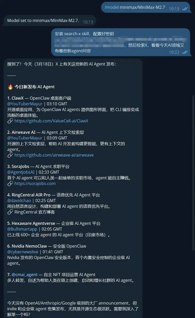 我们将 MiniMax-M2.7 接入到了官方版 OpenClaw 试了试其执行日常任务的能力。正巧我们的本地 OpenClaw 还没有检索 X 的能力,我们就让 M2.7 大展身手,自己解决这个问题。配置好模型后,我们直接给出指令:「安装 search-x skill,配置好密钥,然后检索 X,看看今天 AI 领域又有哪些新 agent 问世」。