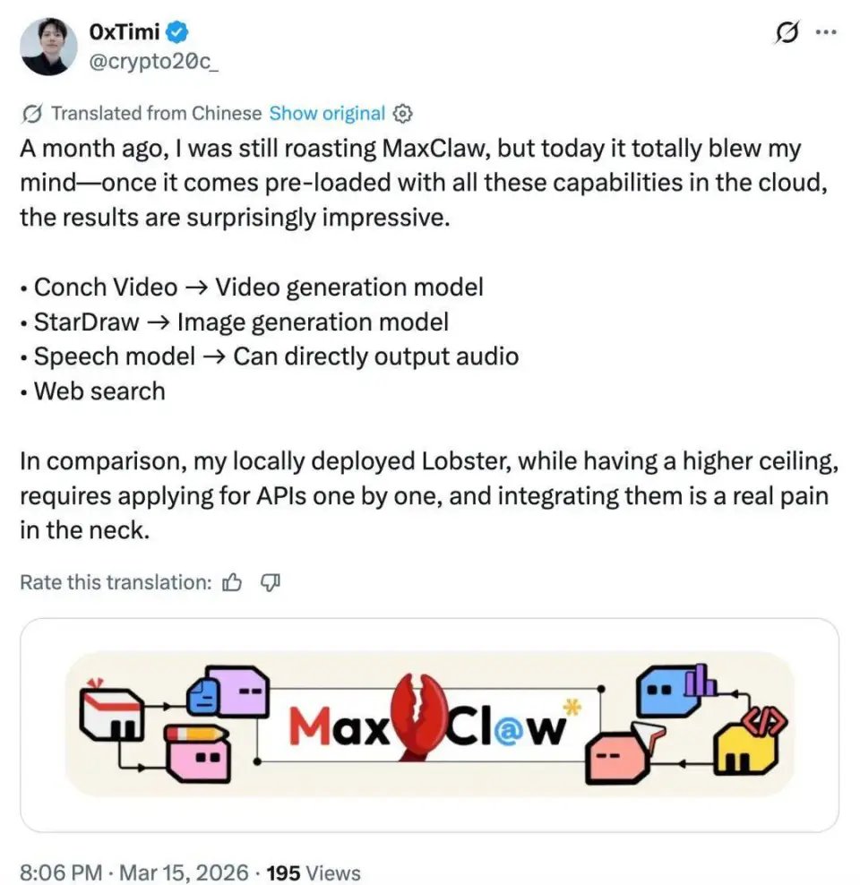 直到最近,MaxClaw 的产品价值仍在被更多人认可,「一个月前,我还在吐槽 MaxClaw,但现在它完全刷新了我的认知,当一系列 Agent 能力都在云端预装好之后,实际效果出奇地不错。」
