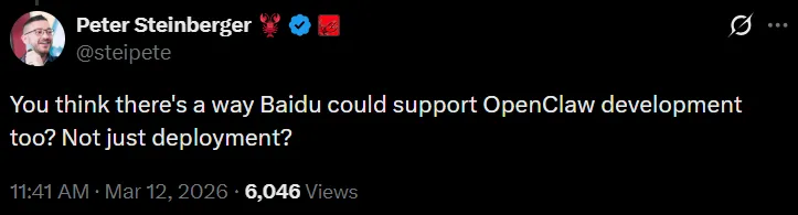 所以当他在X上看到百度工程师在北京科技园摆摊帮近千人装龙虾的照片时,回了一句「Amazing」,紧接着追问了一个更实质的问题:百度能不能不只是帮用户部署,而是参与到OpenClaw本身的开发中来?