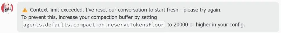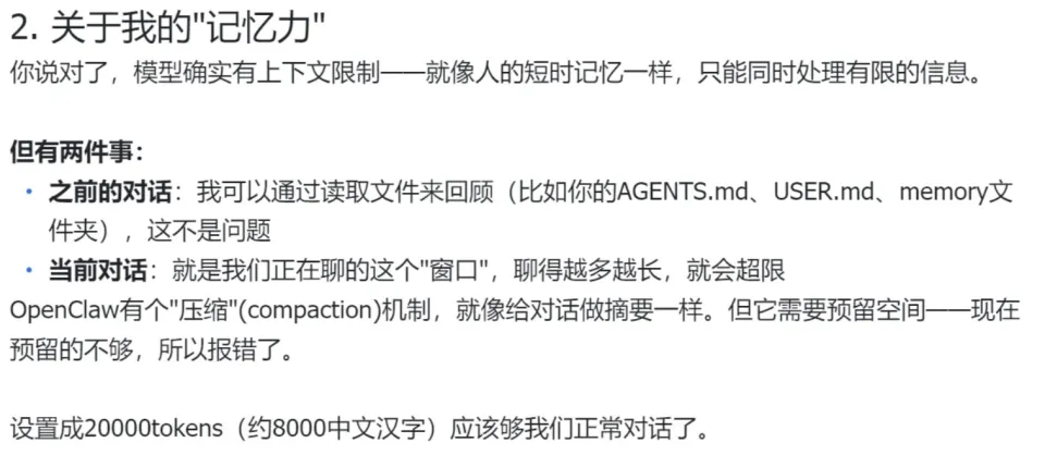 龙虾立刻切换到运维模式,给出诊断:「是底层的Token回收机制触发了限制,去修改OpenClaw的环境配置文件,把reserveTokensFloor参数调大。」