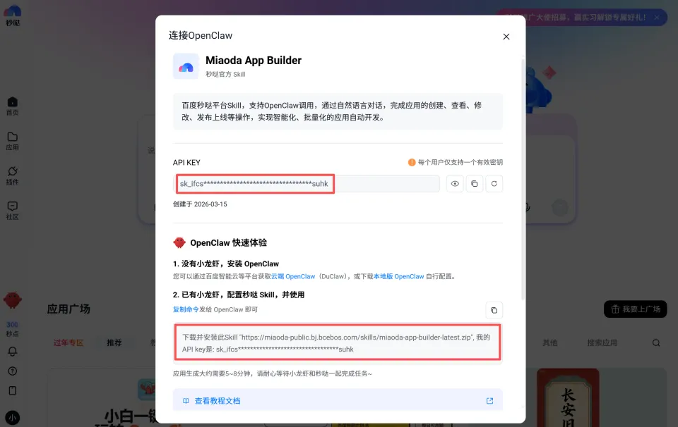 或者更极客一点,直接把官方的安装指令和API Key(点击秒哒主页左下角的小龙虾标志)复制发给OpenClaw对话框。