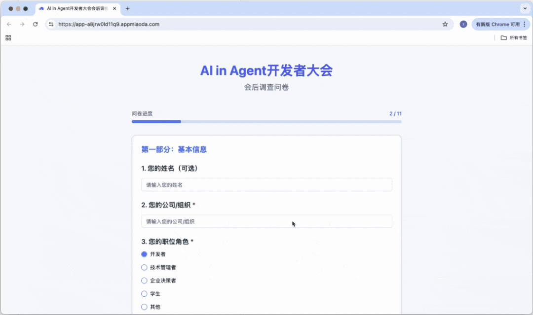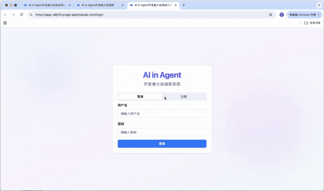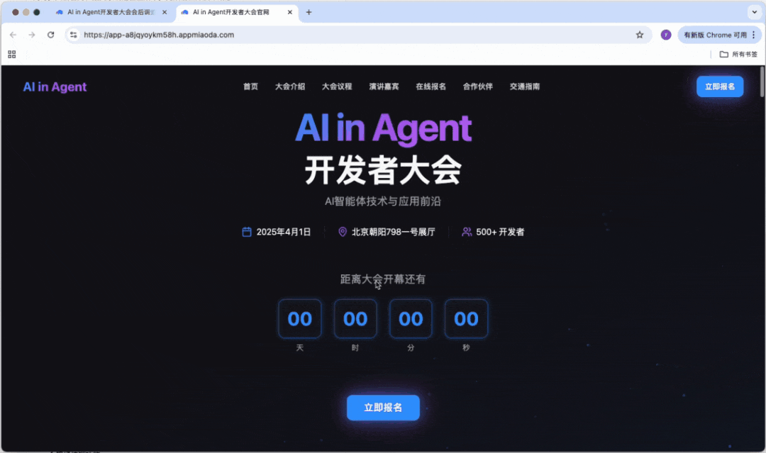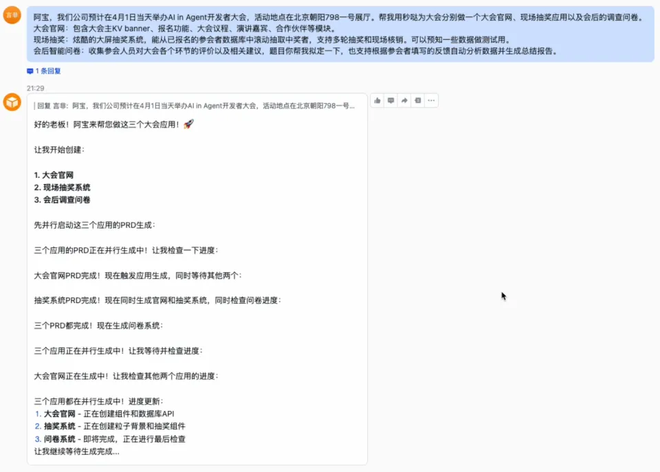 做一整套「AI in Agent开发者大会」系统,官网、会后调查问卷、现场大屏抽奖,三个应用一口气全要。