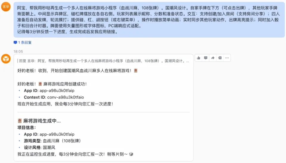 有趣的是,因为三个应用同时生成,过程稍长,开发者中途随口问了一句「进度如何」。