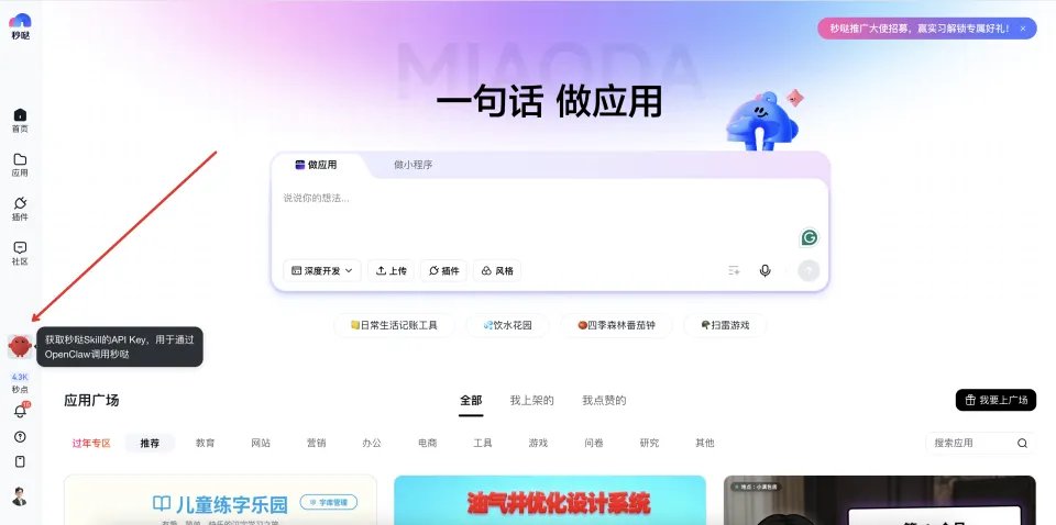 打开秒哒官网,点击可爱的龙虾标志,就能拿到API KEY了。