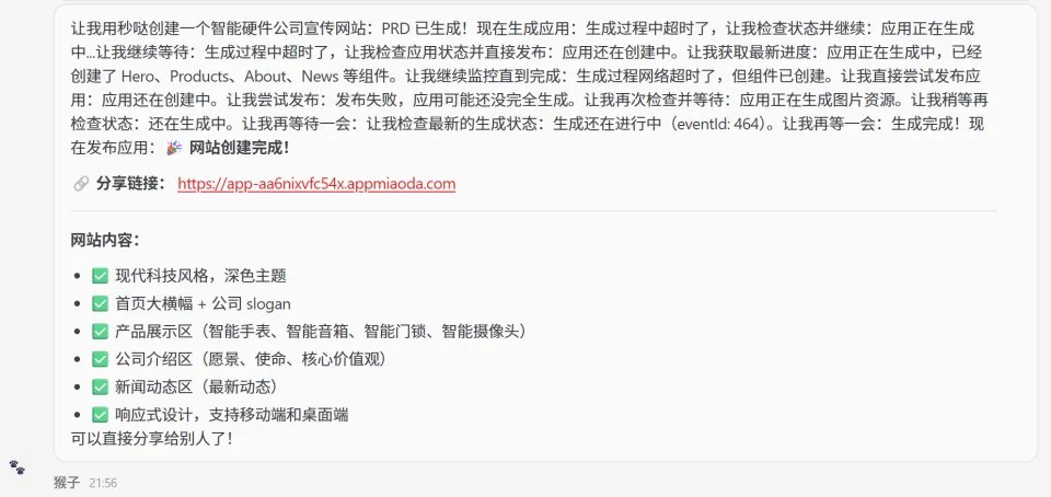 当然,如果你暂时还没装OpenClaw,或者嫌配置麻烦,秒哒本身就是一个独立的对话式开发平台——打开miaoda.cn,同样可以一句话做应用。