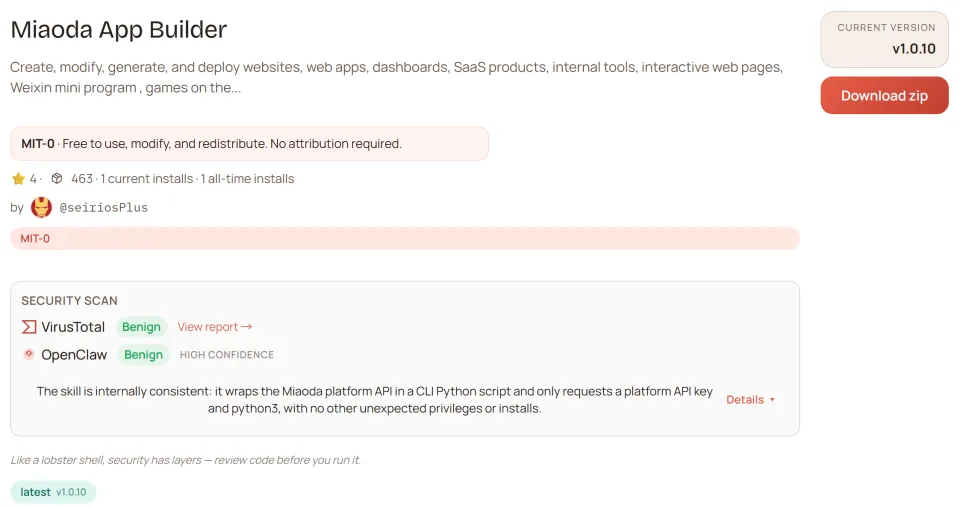 Miaoda App Builder正式上架ClawHub,全球首个把完整应用开发能力封装成Skill的技能包。