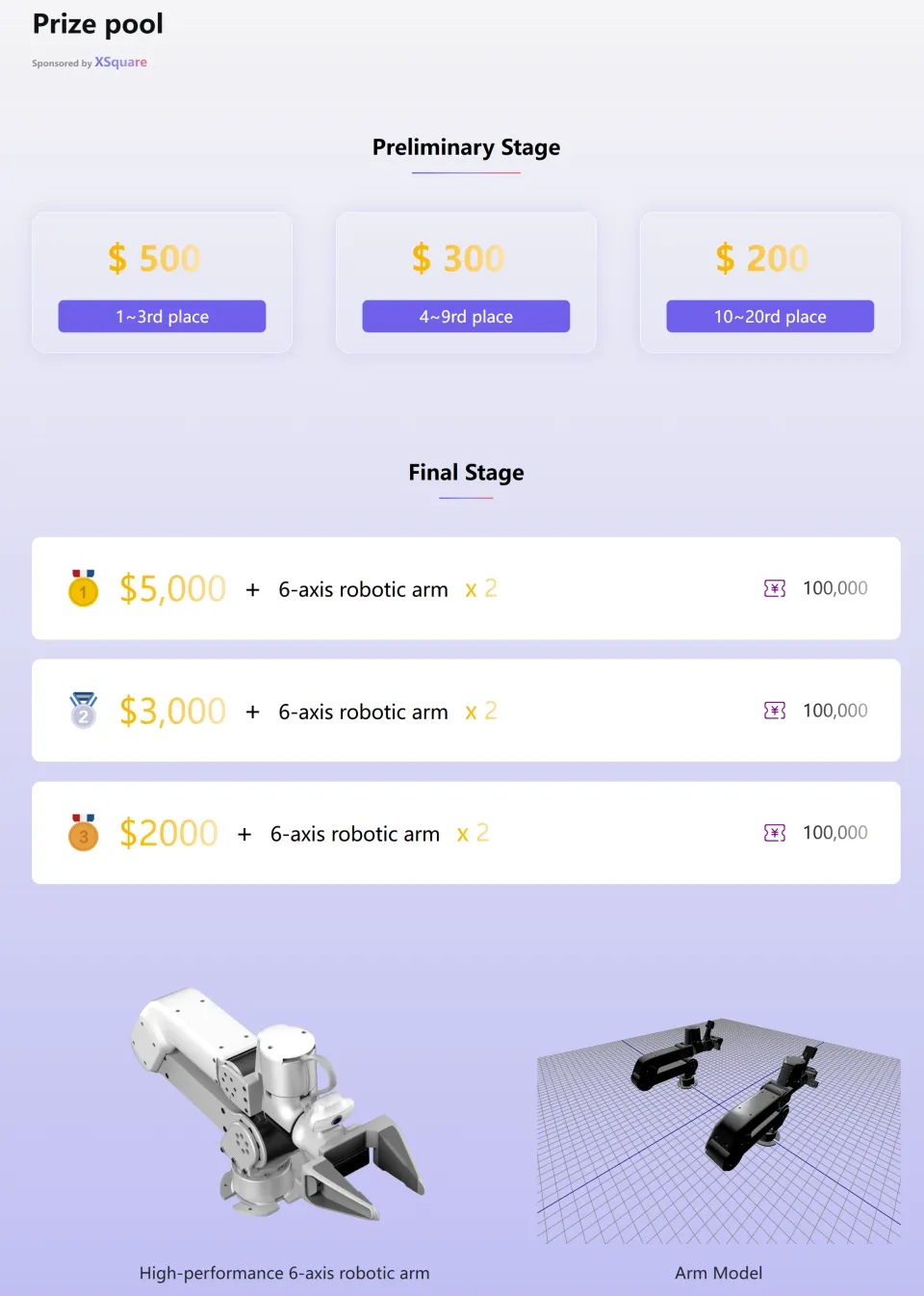 在初赛阶段,第 1 名至第 3 名的队伍将获得 500 美元,第 4 名至第 9 名将获得 300 美元,第 10 名至第 20 名将获得 200 美元。而在最终的决赛阶段,冠军队伍将斩获 5000 美元以及 2 台 6 轴机械臂,亚军和季军也将分别获得 3000 美元 + 2 台 6 轴机械臂,以及 2000 美元 + 2 台 6 轴机械臂的奖励。