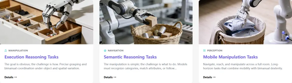 在 ManipArena 的任务库中,没有任何毫无挑战的简单抓取测试。这 20 个真机任务(分为 15 个桌面任务和 5 个需要空间导航的移动操作任务)全部以推理为核心考量,区别仅仅在于推理的瓶颈发生在哪里。
