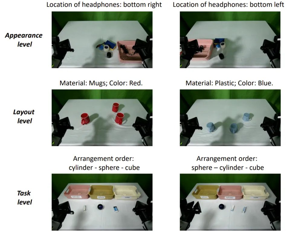 这种设计可从物理源头上彻底排除阴影移动、高光反射以及白平衡变化等视觉干扰,进而能保证模型性能差异纯粹反映策略能力的强弱,满足了科学实验严谨性的基本要求。同时,在绿幕环境下,还可以进行更多可控的分层泛化的实验,比如像影视制作一样直接给机器人换个操作场景。