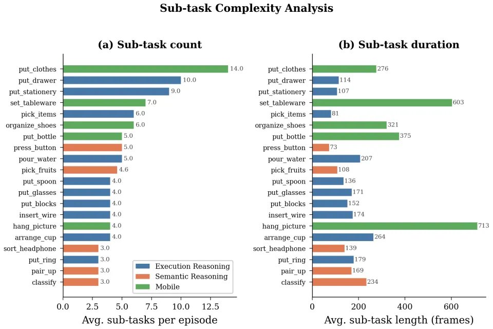 以最具挑战性的衣物收纳任务为例,机器人需要完成 3 次往返,经历 14 个连续的子步骤,平均耗时高达 194 秒。这种长序列的设定,对当前视觉语言动作模型在固定上下文窗口下的时序建模能力提出了极大的考验。