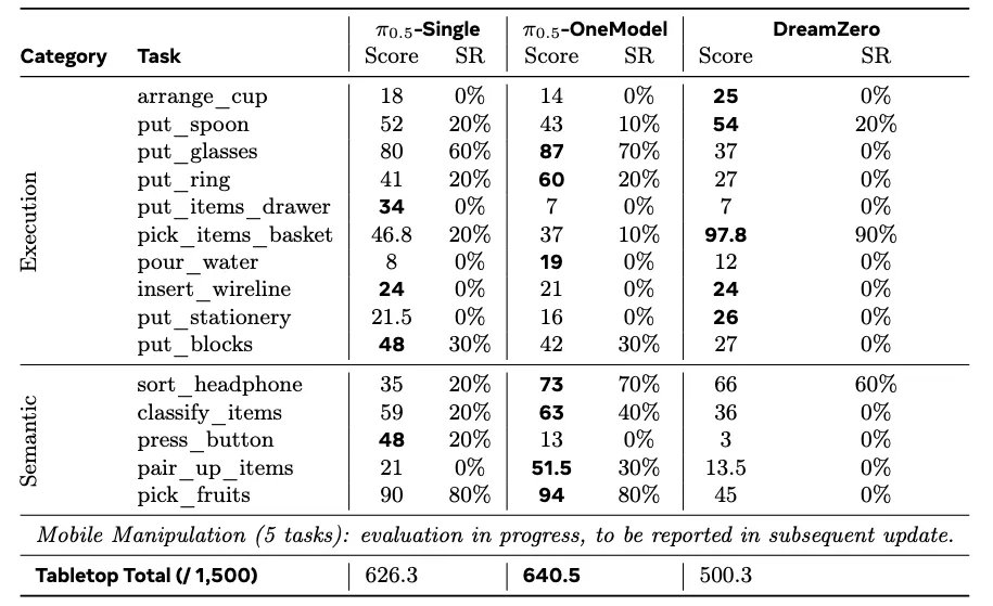 从总分来看,在满分 1500 分的挑战中,π₀.₅-OneModel 以 640.5 分领跑,π₀.₅-Single 紧随其后获得 626.3 分,DreamZero 则为 500.3 分。观察成功率(SR)可以发现,大量任务的成功率为 0%。这充分说明了该评测体系具有极高的挑战性。详见下表: