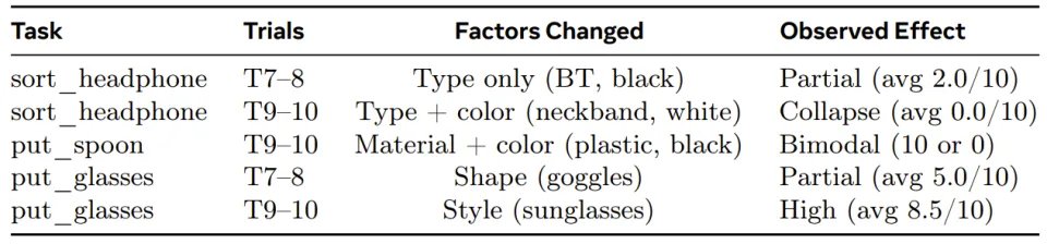 在单一因素发生改变时,模型尚能保持一定的任务完成度。例如在耳机分类任务中,仅改变耳机类型时,模型平均能获得 2.0 分。一旦面对复合型分布外测试,即同时改变耳机的类型和颜色,模型的表现会立刻出现灾难性崩溃,平均得分直接降为 0 分。而在勺子放置任务中,当材质和颜色同时发生改变时,模型的得分呈现出极端的两极分化,要么拿满分,要么直接得 0 分。