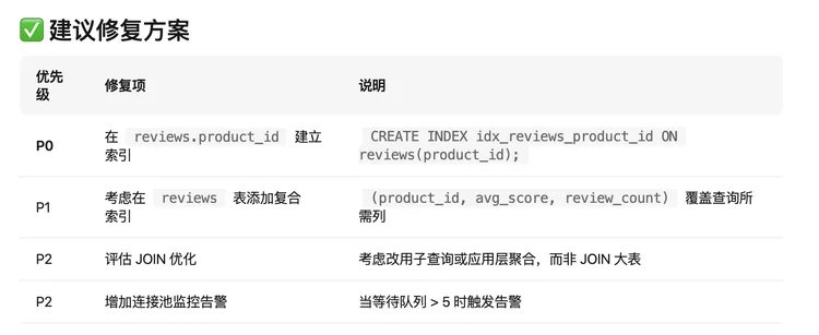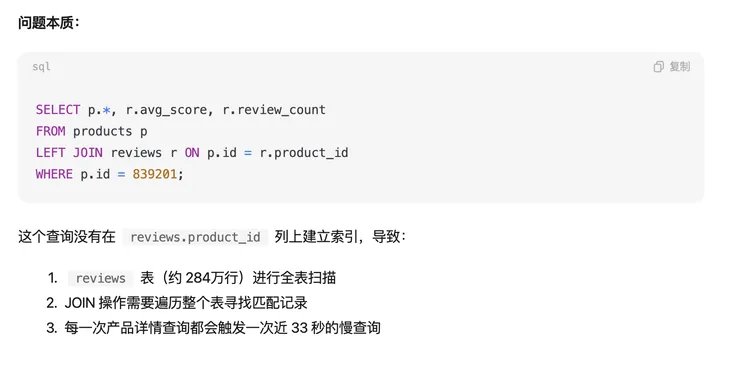 但修复方案还是比较书本的“标准答案”。它建议直接 CREATE INDEX,没有提在 284 万行生产表上这条命令会锁表,也没有给出先剥离 reviews 数据让页面先能加载的止血思路。