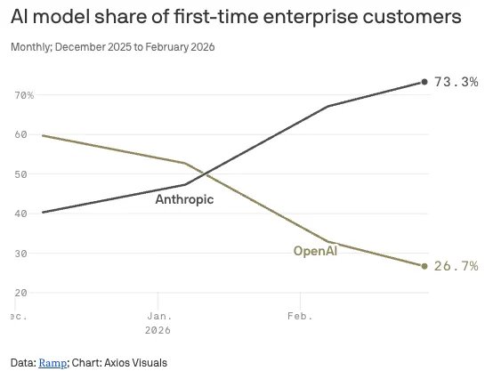 更恐怖的是,在首次采购AI工具的企业中,Anthropic的占比直接超过了73%,碾压OpenAI。