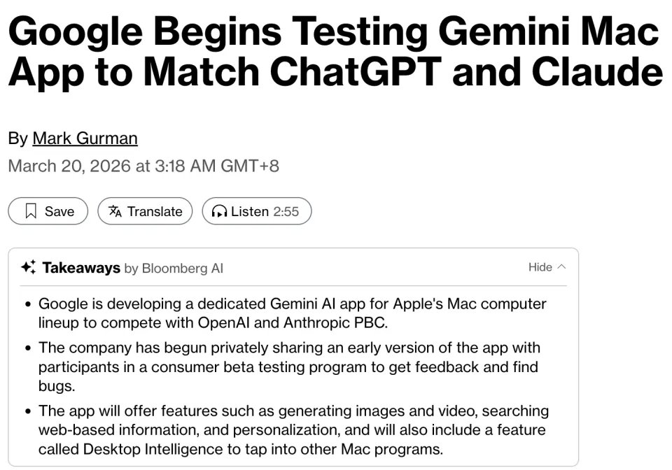 Gemini Mac一旦正式发布,它在苹果生态里可能拿到OpenAI和Anthropic难以撼动的入口优势。