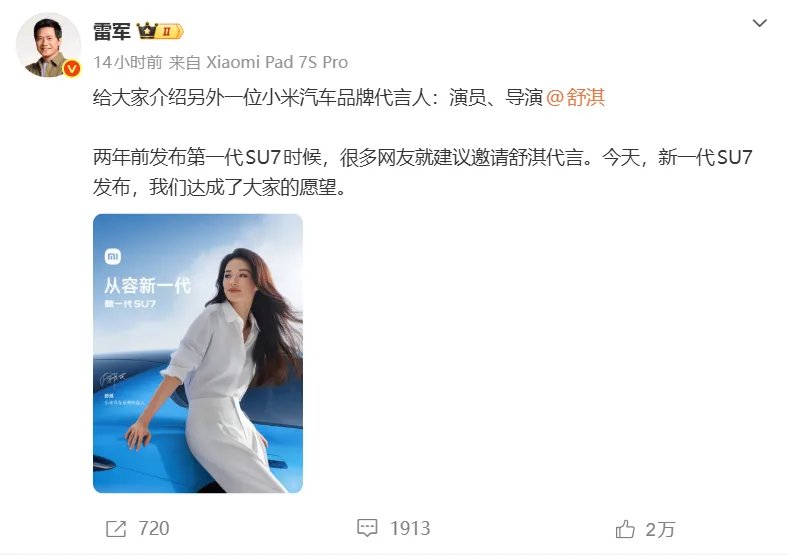 小米创办人、董事长兼 CEO 雷军表示:两年前发布第一代 SU7 时候,很多网友就建议邀请舒淇代言。今天,新一代 SU7 发布,我们达成了大家的愿望。