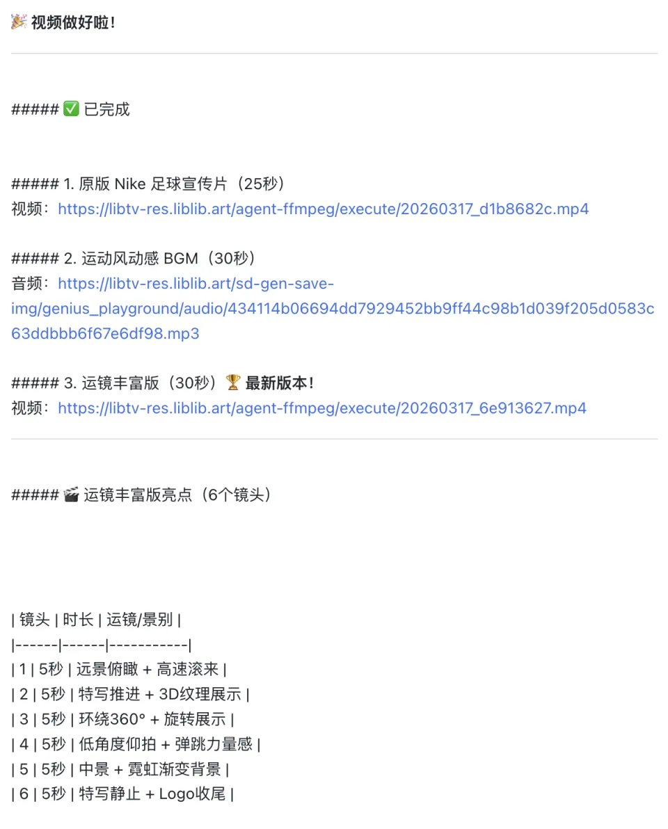接下来,LibTV Agent 会自动解构那段视频的镜头语言,自己去理解镜头组接、写脚本、画分镜、生成片段、完成剪辑。