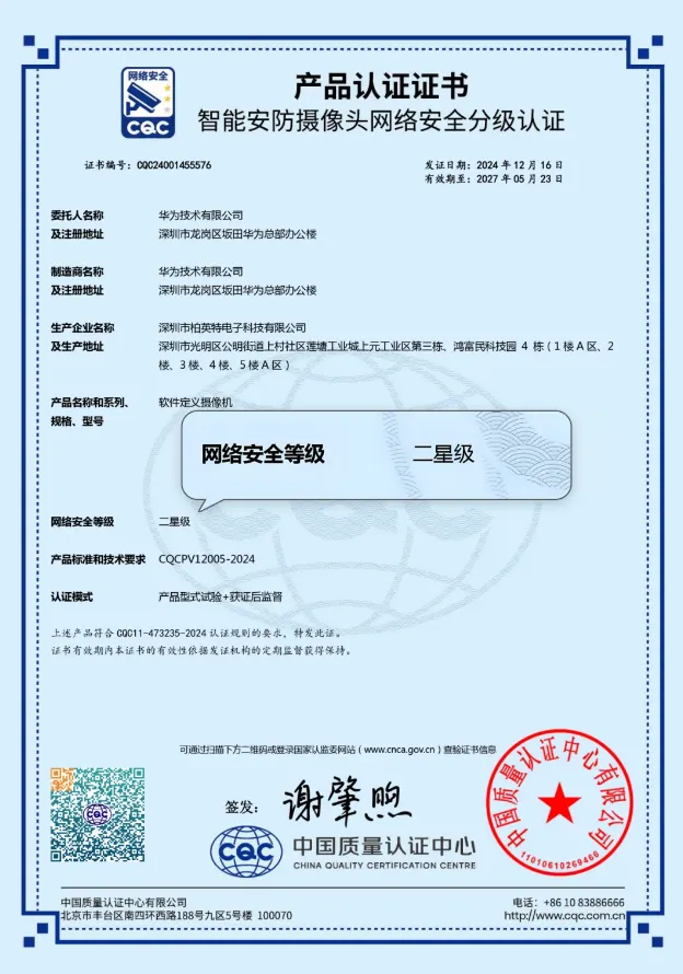 目前,华为行业感知新一代鸿蒙摄像机已经获得中国CQC二星、无锡所三星级等国家机构权威认证,拥有网络安全方面的权威认证资质。
