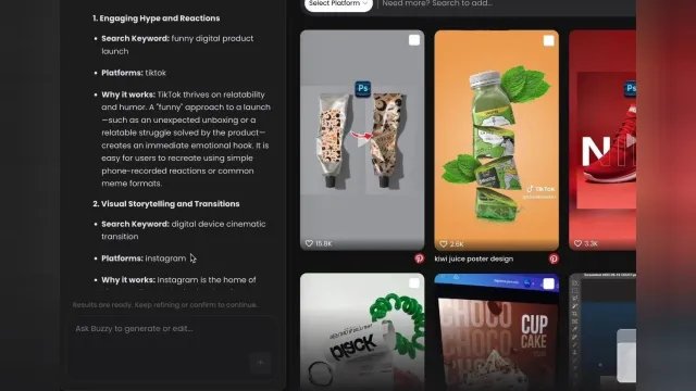 Buzzy的答案是,让AI从创意环节开始介入,给Agent接入互联网上活的、会传染的创意数据流,然后和你一起创作视频。