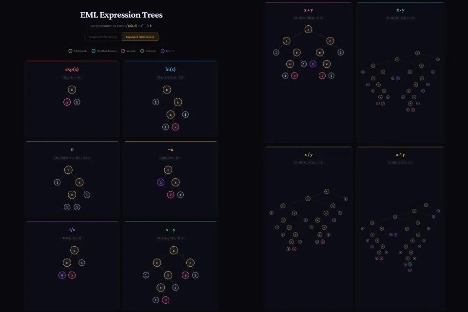 【新智元导读】别再为背公式发愁了!一个算子eml(x,y)就能搞定一切。指数函数?y=1即可。对数?三层嵌套。π?五层。这项发现不仅改变数学观,还启发我们:宇宙底层代码可能极致简短,一个算子统治全部。