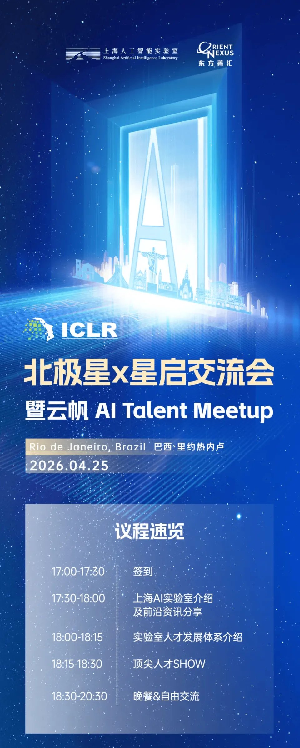 4月23日至27日,ICLR 2026将在巴西里约热内卢召开。期间,上海人工智能实验室(上海AI实验室)将举办“北极星X星启交流会暨云帆AI Talent Meetup”。届时,实验室相关领域专家将亲临现场,与全球同行展开深度交流与研讨。