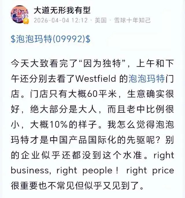 之后,他先是看完了王宁的访谈录《因为独特》,后又实地探访了一家海外泡泡玛特门店并发出感慨,“我怎么觉得泡泡玛特才是中国产品国际化的先驱呢?别的企业似乎还都没到这个水准”。